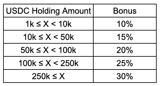 Holding Bonus: Depending on how much USDC deposited and held in BSX exchange in each epoch, participant will earn bonus accordingly to the table below: